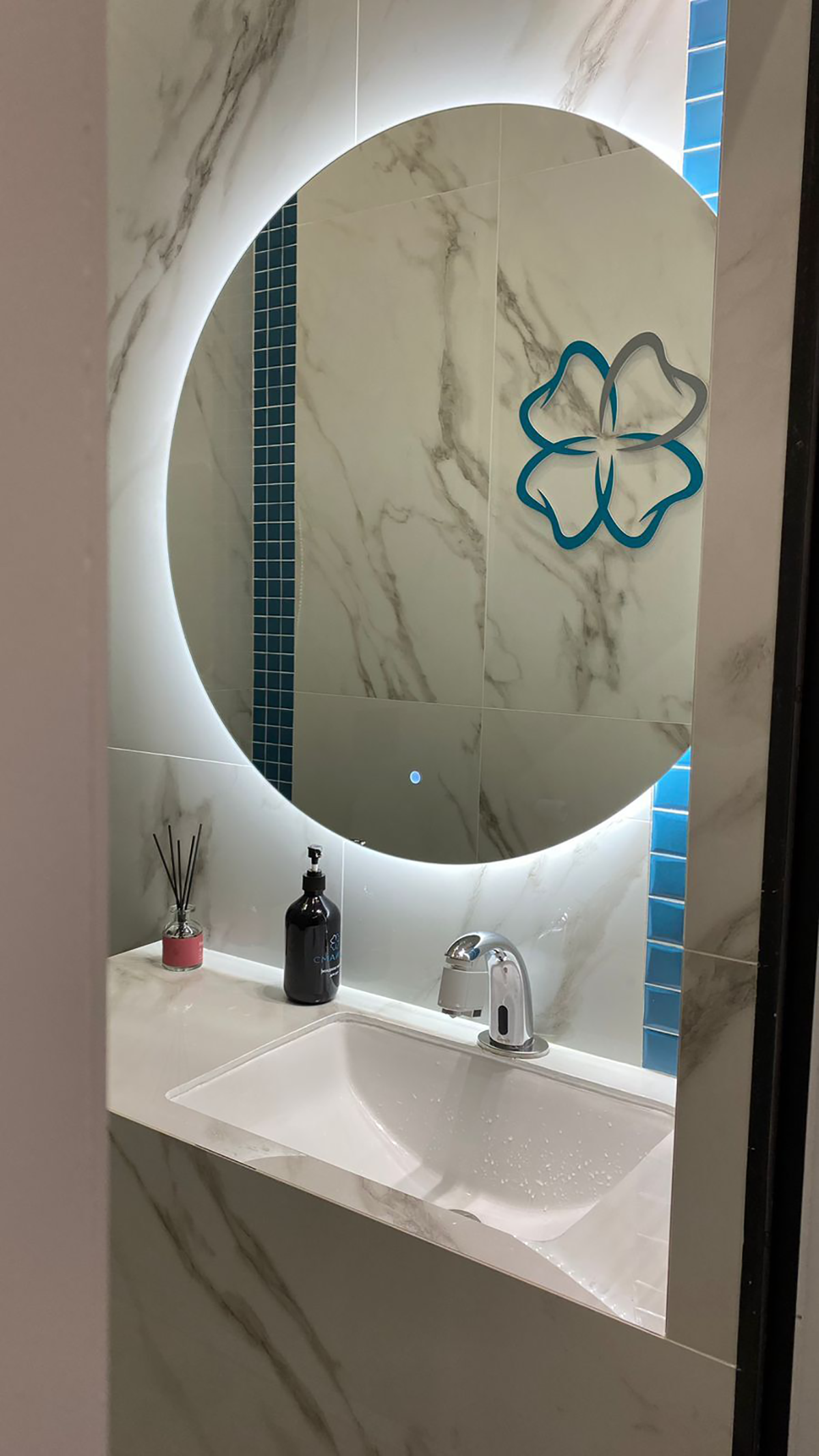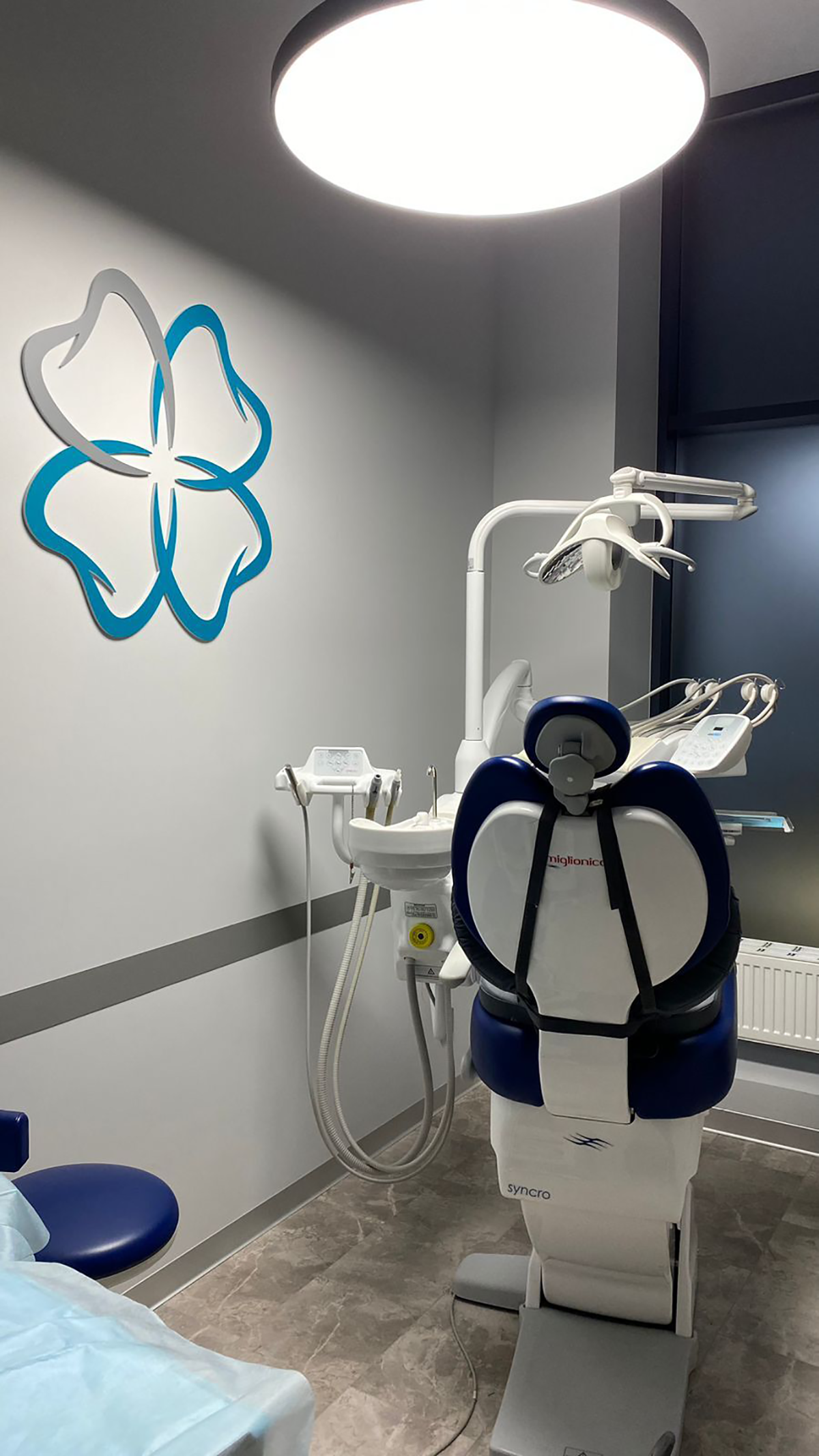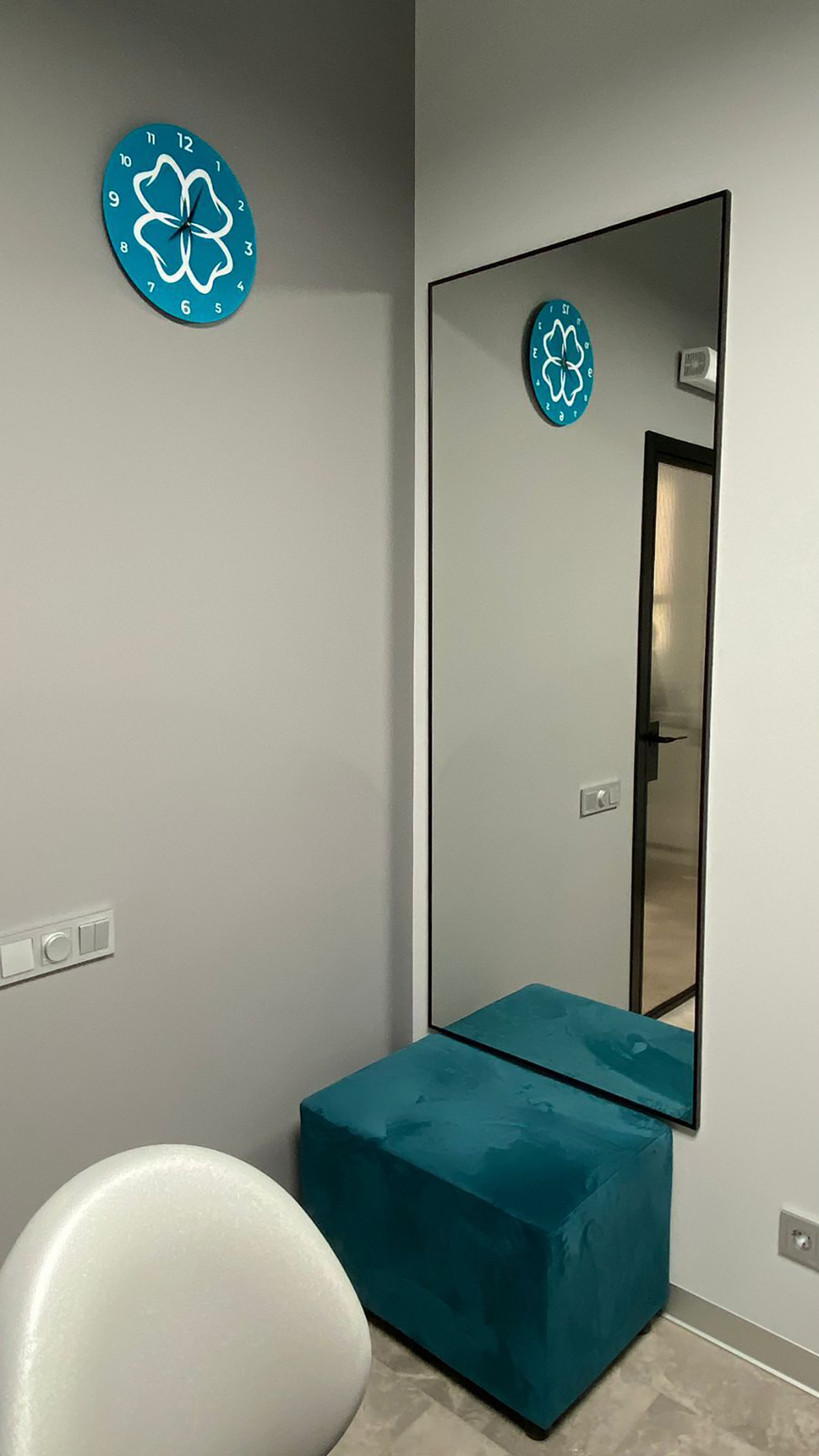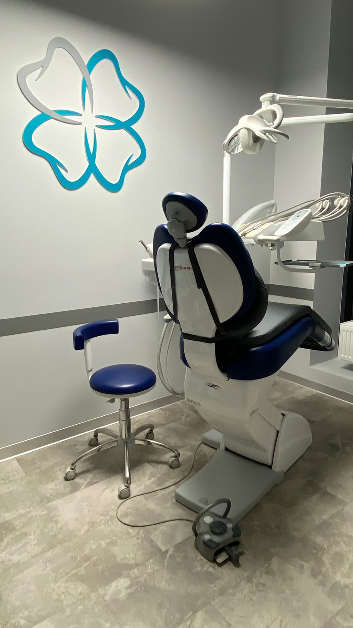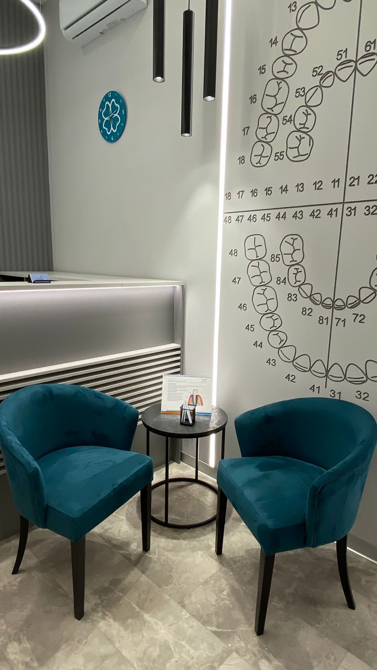 Хай-тек интерьер наполнен холодными цветами, его основные оттенки: серый, чёрный и белый. Главным цветом нашего дизайн-проекта стал корсар. Используя его в элементах декора, наша команда расставляла акценты, в которых раскрывается индивидуальность стоматологии: логотип в зоне ресепшен, часы, мягкий диван, удобные кресла.