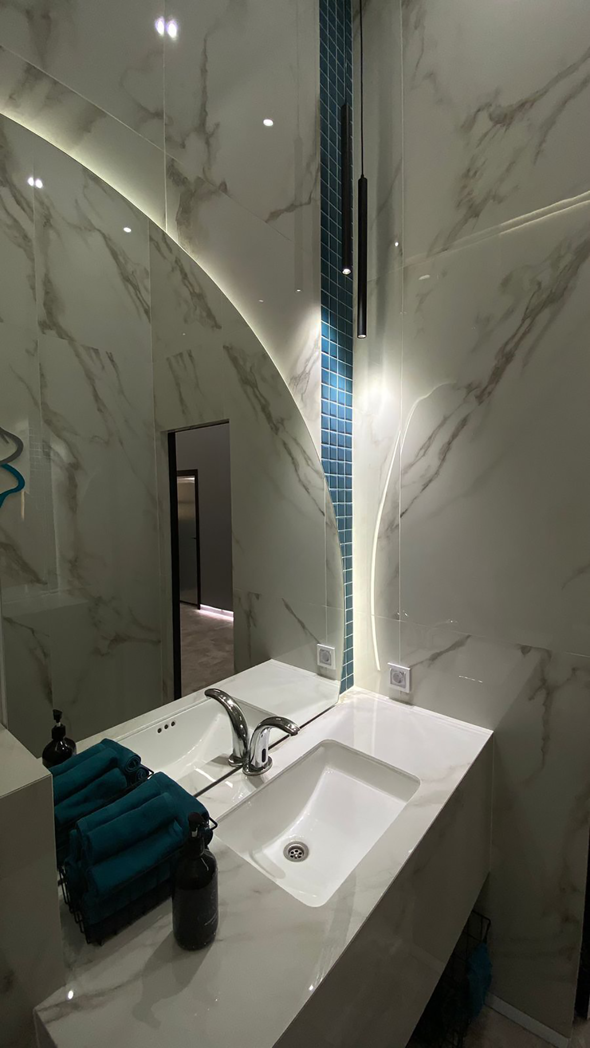 Специалисты дизайн-студии Green Art начали работу с черновым помещением без стен. Была использована технология быстровозводимых гипсокартонных стен с усилениями и произведено множество работ по скрытию коммуникации под потолком.