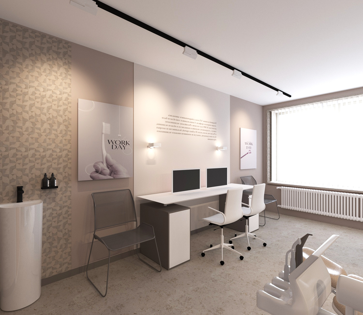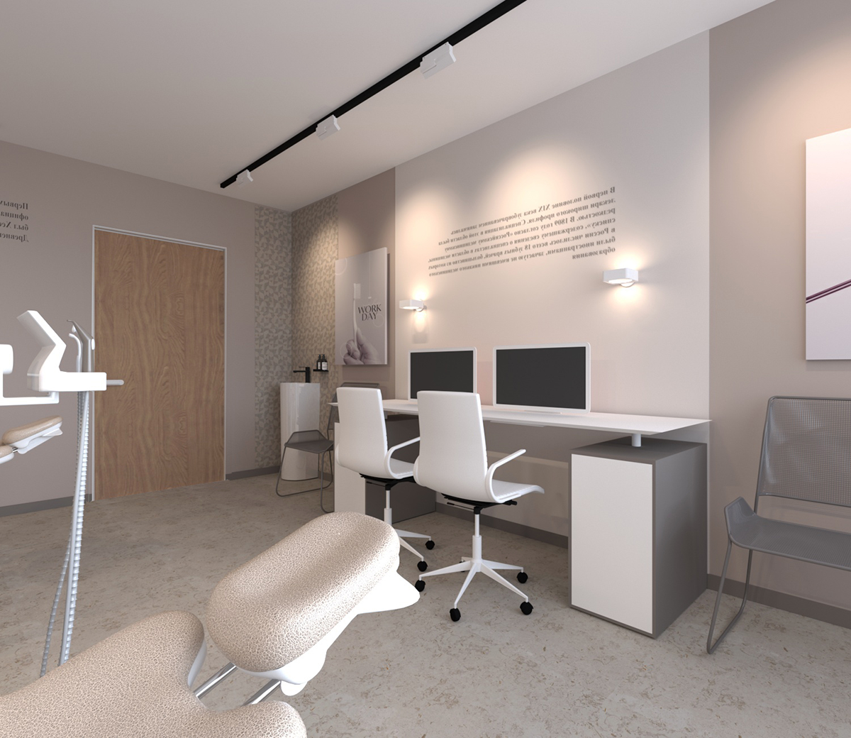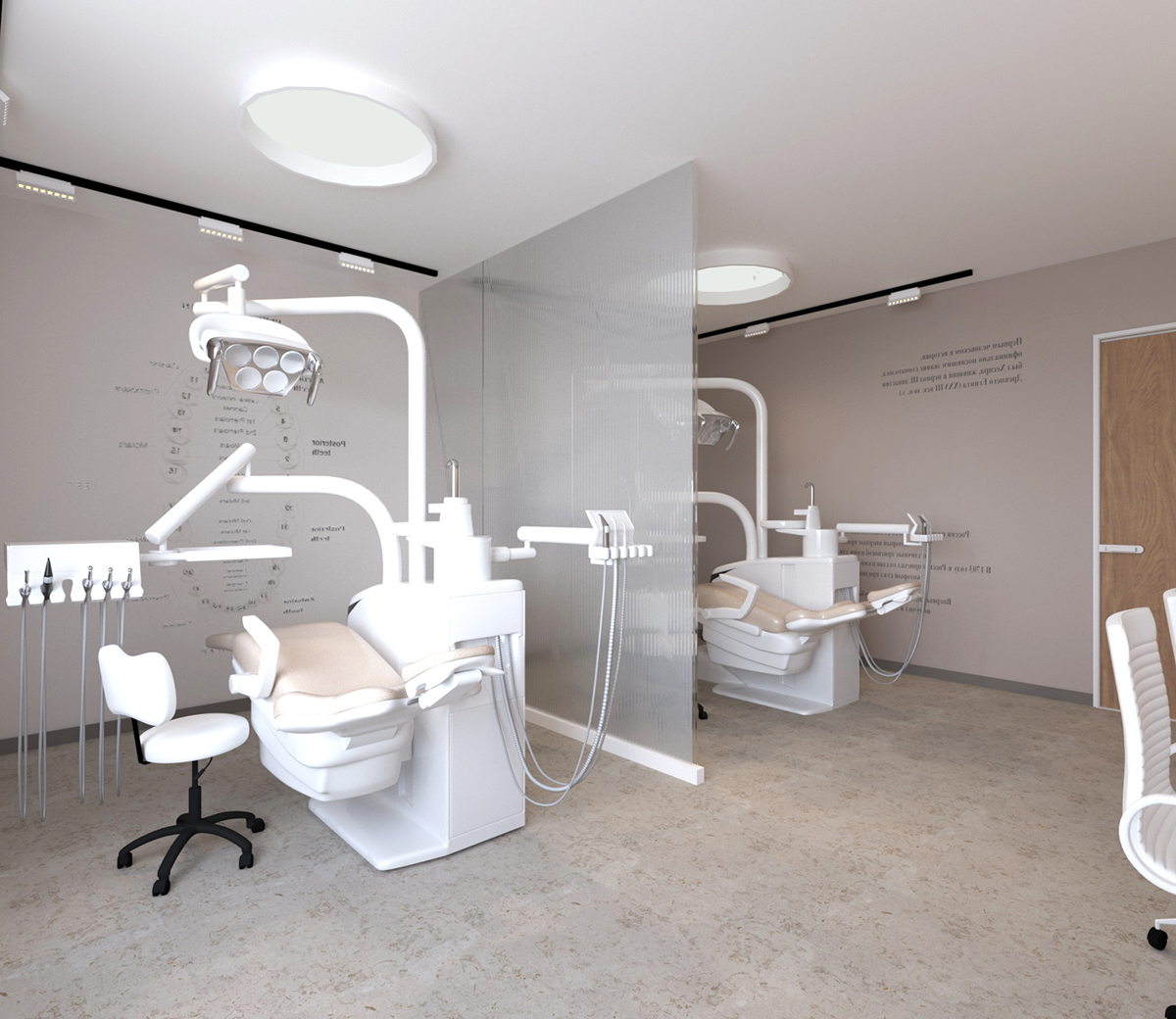 • И тщательно продуманным деталям (стеклянная перегородка в приёмном кабинете, которая делит его на две зоны, обеспечивая комфорт пациентам)