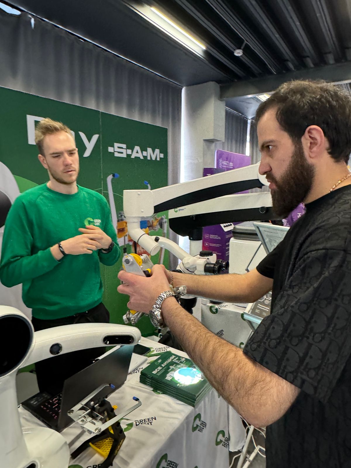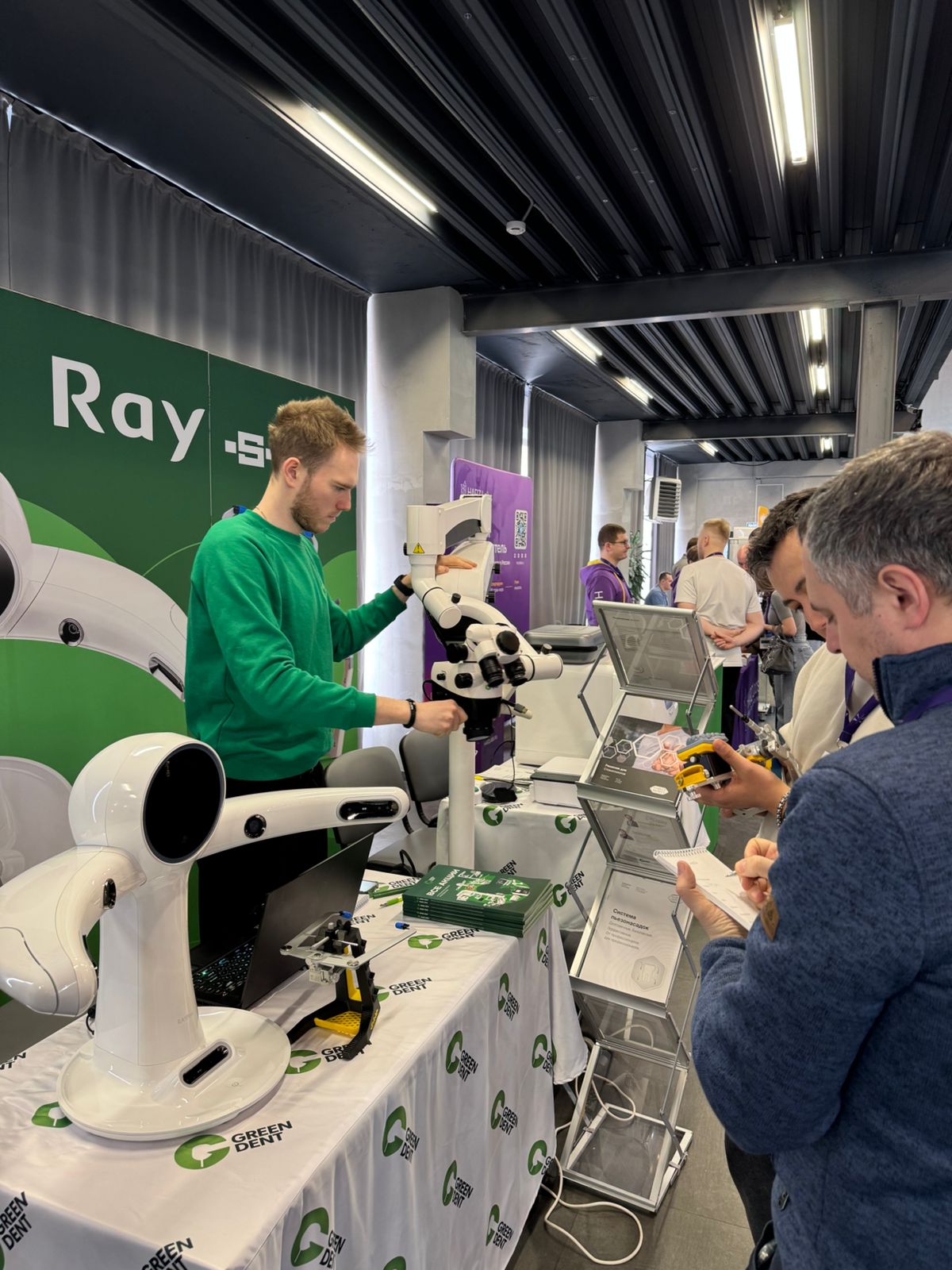 Ну а компания GREEN DENT? — А компания GREEN DENT представила инновационное стоматологическое оборудование, в числе которого: стоматологический операционный микроскоп GreenMED C-Clear, технологии W&H, 3D-сканер лица RAYFace и фрезерный станок RAYMill C.